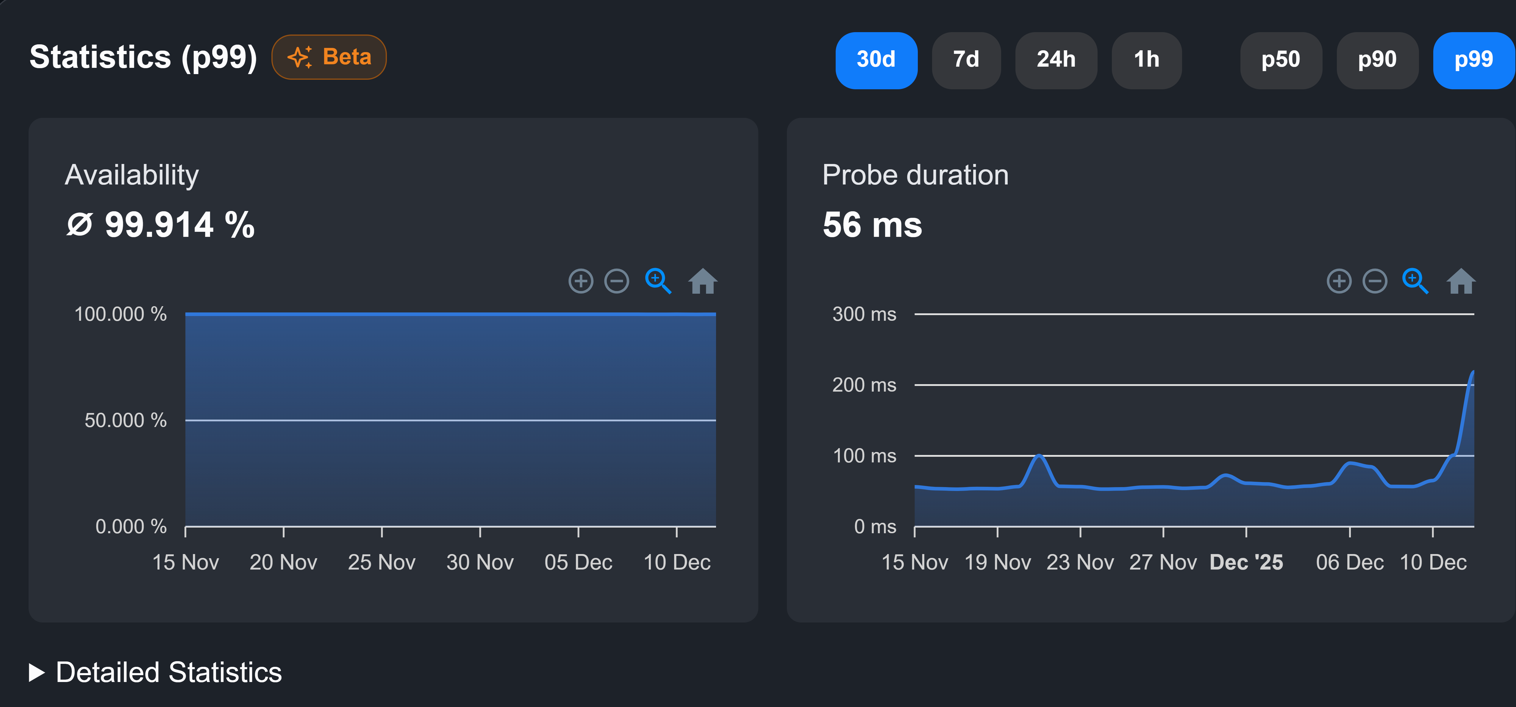 To better understand the performance and availability of your services, we offer a variety of monitor statistics. The availability and probe duration are displayed in your monitor overview, which looks like this: